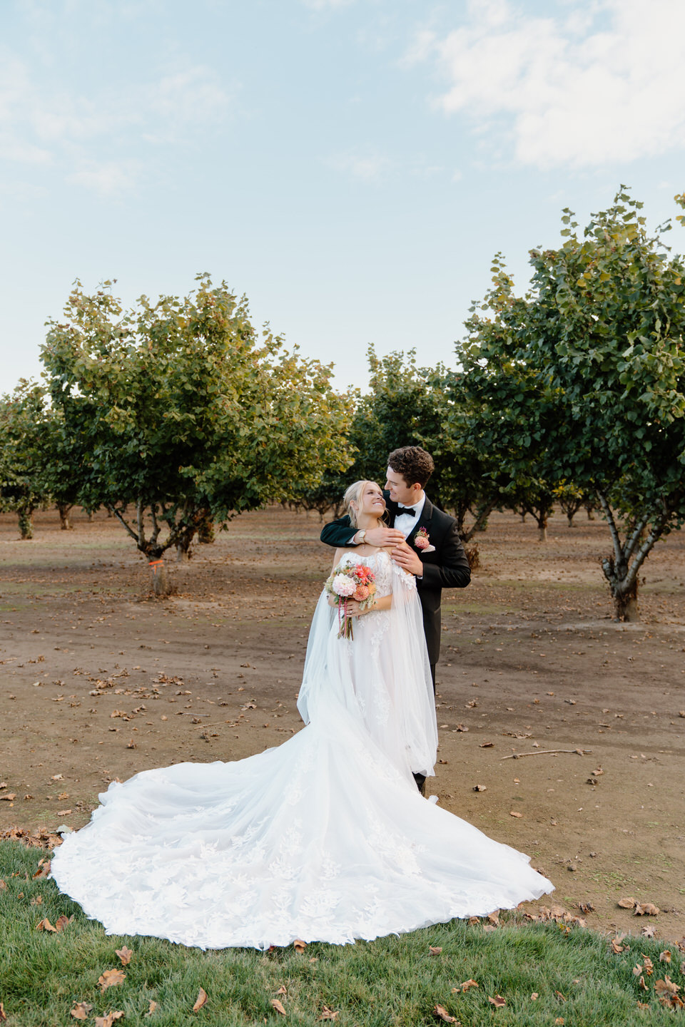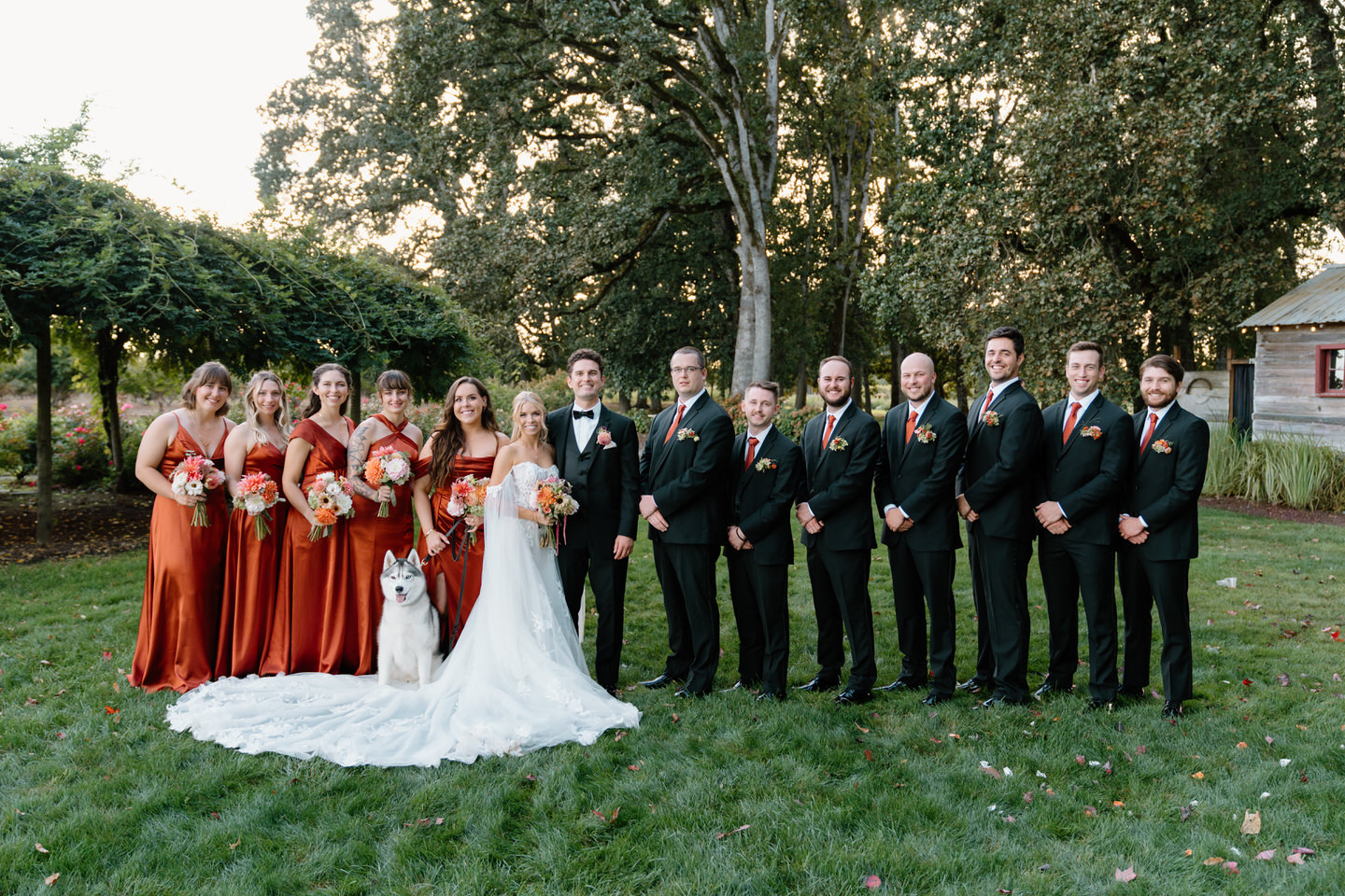 This fall I had the pleasure of capturing Morgan and Brett’s perfect fall wedding at Postlewait’s Country Weddings in Canby, Oregon. The location can be found out in the country at 29510 S Barlow Rd, Canby, OR 97013. This couple was fortunate enough to have perfect fall, Oregon weather to gather for their outdoor wedding ceremony. Postlewait’s has a great outdoor space for wedding ceremonies and receptions. They also had so many fun personal touches, like including Morgan’s husky in the ceremony and having late night pancakes served by the couple themselves.